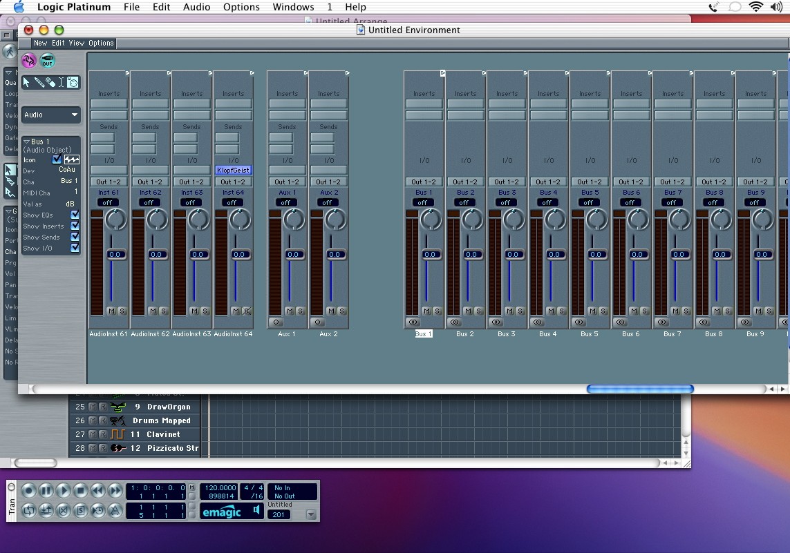 | Here I've scrolled over and highlighted Bus 1. You can check out the parameters for this object on the left side of the window. Click on the check box labeled "icon". The small icon will change from being crossed out to having color. This object can now be found on the arrange page, but you'll have to create a track object to show it. First, lets change the icon property on a few more objects so we can put them on the arrange page. Repeat the above process for as many buses as you'll think you need. You'll want to use buses for submixes and/or applying processor intensive effects like reverb. |