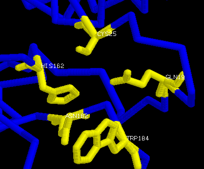 The two key groups for catalysis are a sulphydryl group and an imidazole group. The arrangement of Cys25, with its free sulphydryl group, and of His162, the only histidine in actinidin, along with some other residues in close proximity act as the active site of the molecule. The mechanism for the activity of the protein closely mimics that of papain. Cys25 and His162 are the residues the main. The orientation of Gln19 places a NH2 in the active site where it could interact with a substate carbonyl oxygen. The main-chain carbonyl groups of residues 66, 68, and 161 and the main-chain NH groups of residues 25 and 68 also point toward the active site providing units for substrate interaction. The side-chain of Met211 stretches accross the end of the substrate binding pocket making it noticably shorter than in papain. The other binding sites are located around the mouth of the active-site cleft (some in and some out) and near Met211. The reaction that occurs in the active site is as such: