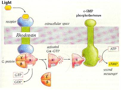 When a photon changes the conformation of rhodopsin to metarhodopsin II, it activates the G-protein transducin and allows the exchange of GDP for GTP. After the binding of GTP, the a subunit of transducin dissociates and bind to cGMP phosphodiesterase which hydrolizes cGMP to 5'GMP. With the decrease of local cGMP, Na+ channels begin to close and the inward current of Na+ decreases. Cells begin to hyperpolarize and the secretion of inhibitory neurotransmitter decreases. Without the neurotransmitter, the bipolar cells synapse with the ganglionic cells and an action potential pass through the optic nerve to the brain. The brain processed the impulse and combines it with other impulses to give an image.