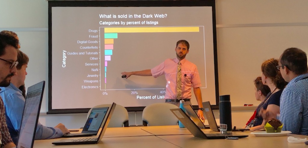 This hackathon was based on Dark Web marketplace data generated by RAND-built scraping tools. About 500K entries (think of them as Craigslist for drugs/contraban) were analyzed by a variety of automated methods.